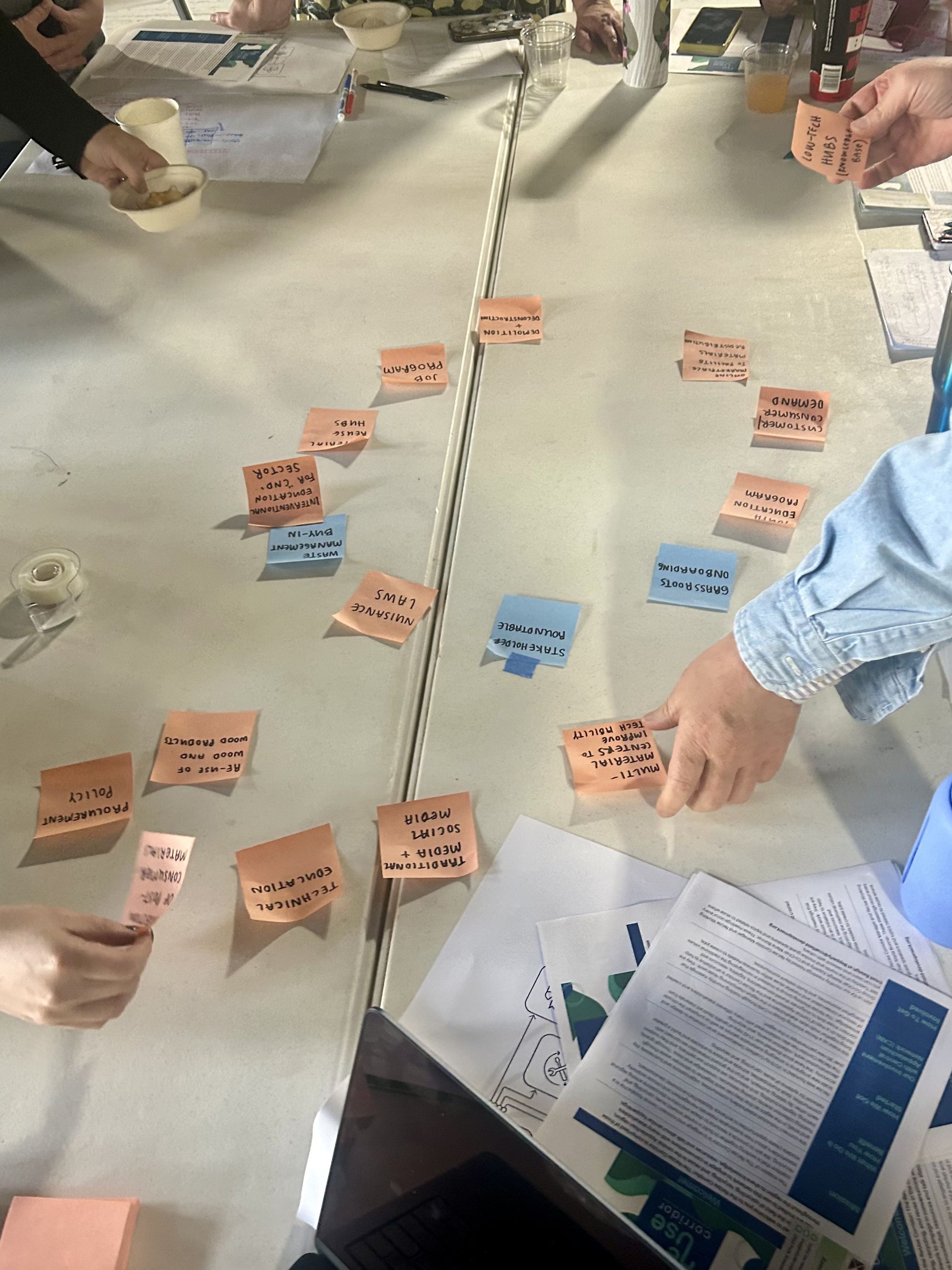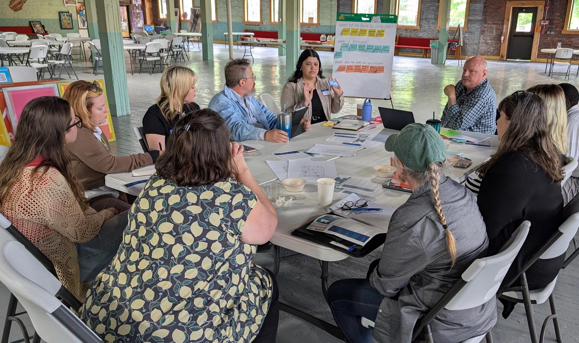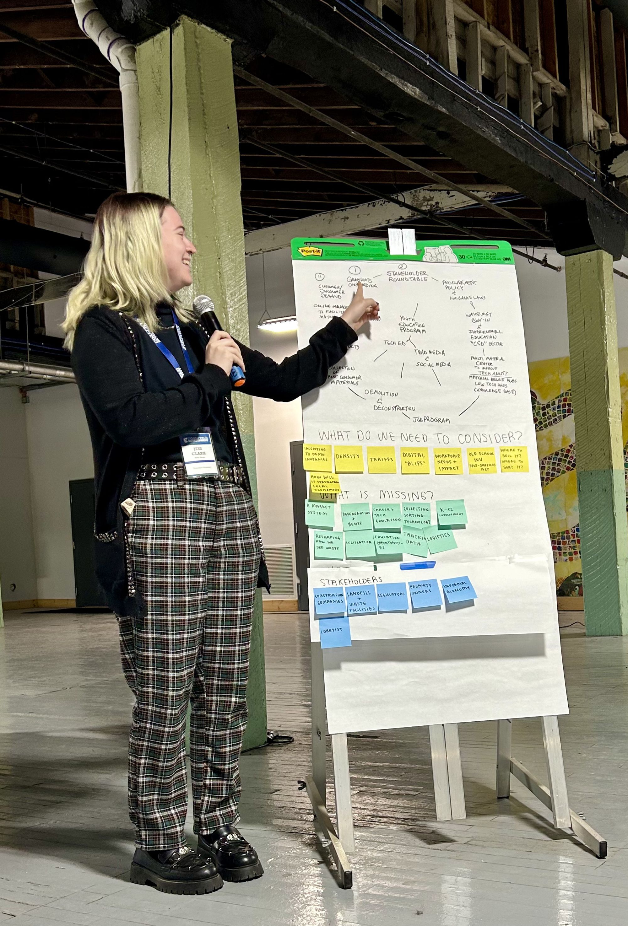 With sticky notes, giant paper pads, and markers scattered across tables, participants split into two groups and dove into ideation. Using prompts such as “What if we created a shared regional hub where manufacturers, recyclers, and designers could exchange reclaimed materials and collaborate via rapid prototyping labs to experiment with new product ideas?”, the teams explored big ideas around circularity, material reuse, and local economic opportunity. This was not just a gathering of individuals, but a community coming together, each person contributing their unique perspective and expertise. While many participants were grounded in circular systems, others brought deep knowledge of community needs and on-the-ground realities.