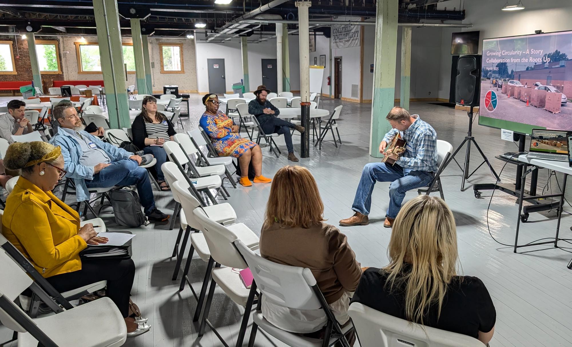 Andrew Dahlgren, Senior Program Manager at Mechanism, introduced the Design Jam format and introduced Steve Deasy of MSW Consultants. Steve, acoustic guitar in hand, strummed a quiet tune before asking the room what it reminded them of. “Family,” one person replied, and Steve agreed. That warmth guided his talk about the disconnection in globalized systems and the need to return to community-based circular economies built on relationships and care.