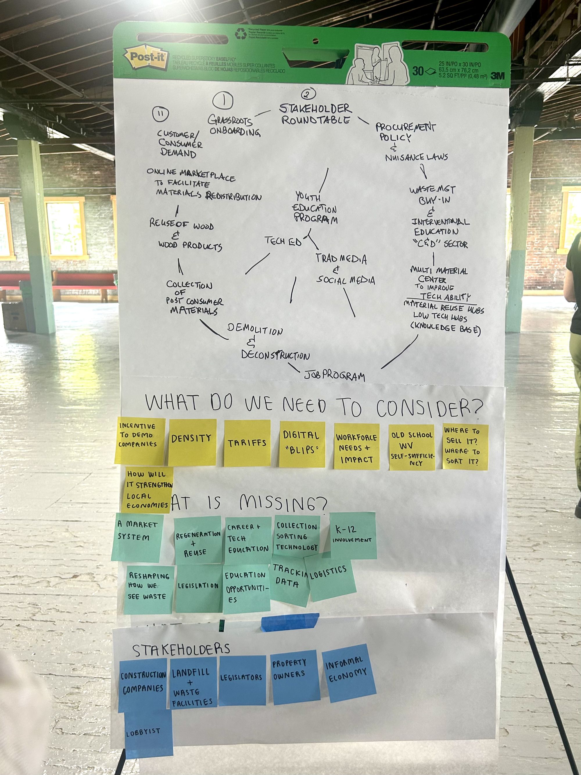 Participants were asked to discuss an array of challenges and generate solutions and new ideas for topics relating to circularity from transportation, logistics, geography, electronic waste, funding, creative reuse, construction and deconstruction, and much more. This conversation was so important to have at a community level, with as many different types of workers and community members joined together as possible because people know their own community best. There is no investor or business that can do a better job than workers and residents at knowing what challenges exist to sustainable waste management in communities across Appalachia, and what ideas should be prioritized and resourced.