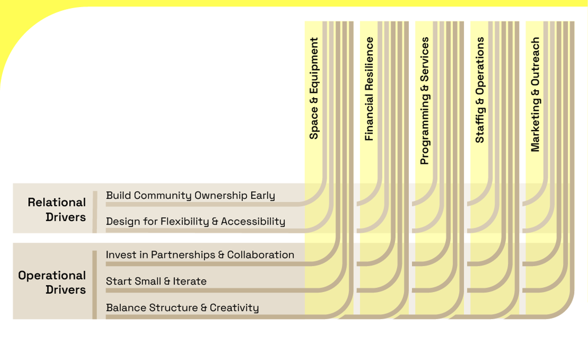 While each Growth Principle supports strategic pillars, they can also be understood through two connected ways of thinking that describe how the organization grows. The Relational Principles focus on people, culture, and inclusion, ensuring that growth stays rooted in community and shared values. The Operational Principles focus on systems, learning, and collaboration, ensuring that growth is organized, adaptable, and sustainable. Together, these ways of thinking show how a makerspace balances connection and structure as it evolves.