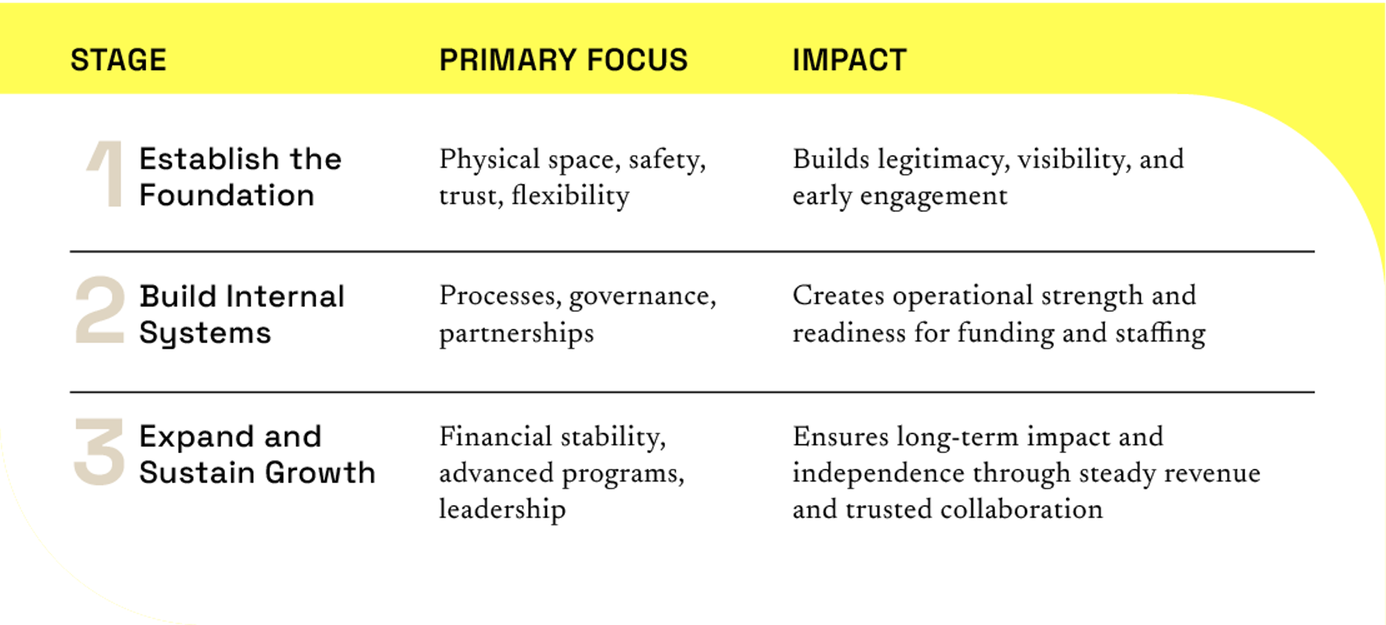 This development strategy unfolds in three stages of growth, each building the foundation for the next. Together, they guide makerspaces from early activation to long-term sustainability, ensuring that community engagement, operational strength, and leadership development grow in tandem.
