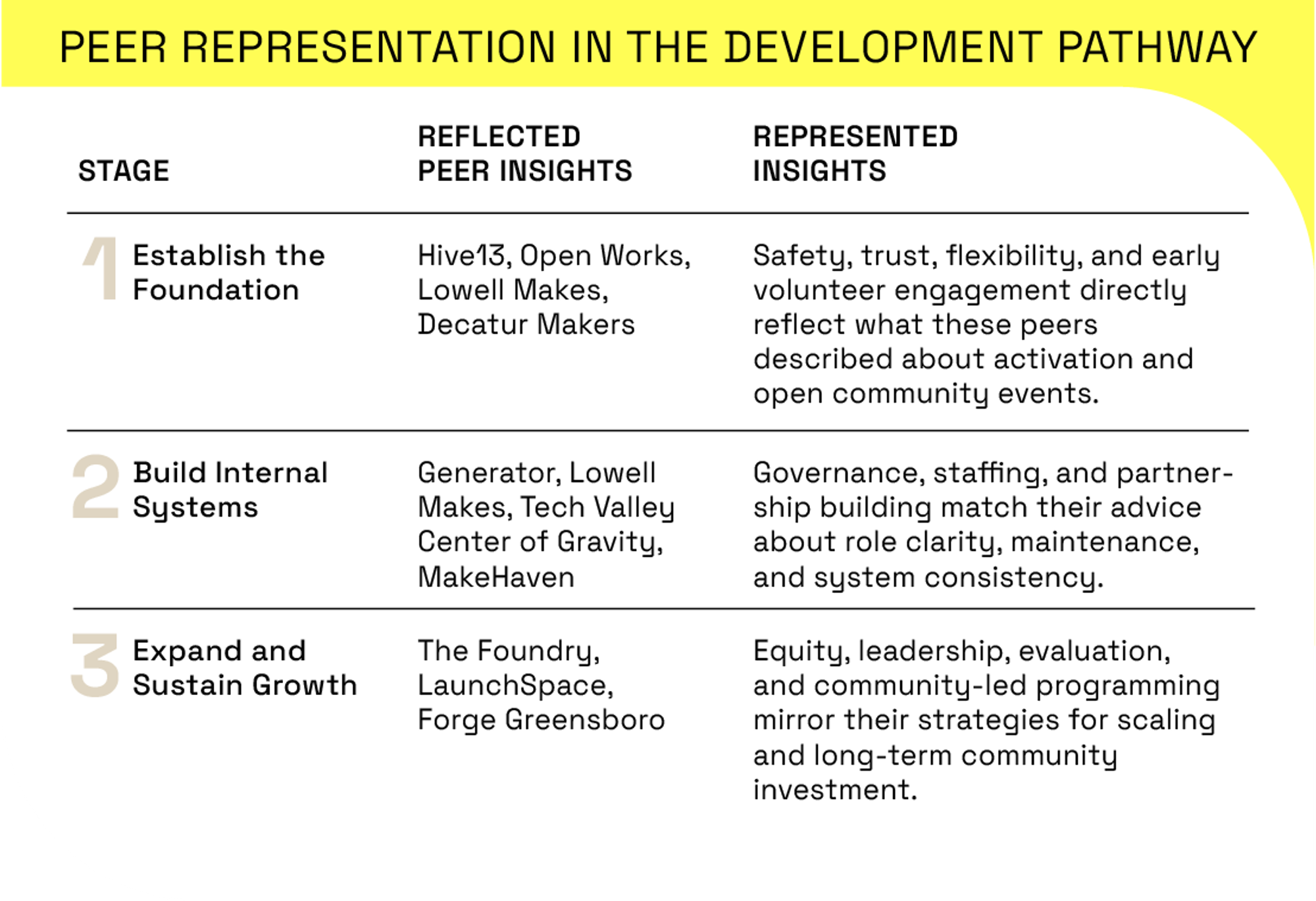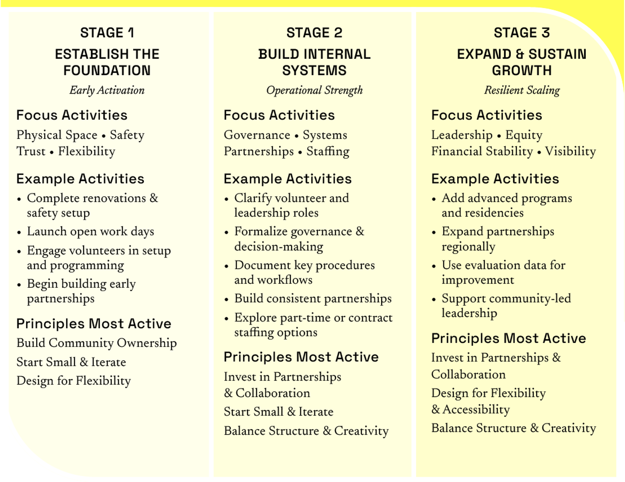 The table below shows how each principle applies differently as the makerspace evolves. Each principle evolves across stages, guiding how makerspaces apply their values as capacity grows. Highlighted principles in the table show where the organization should direct its primary attention at each stage. Other principles continue in the background, each one grounded in insights from the ten peer interviews.