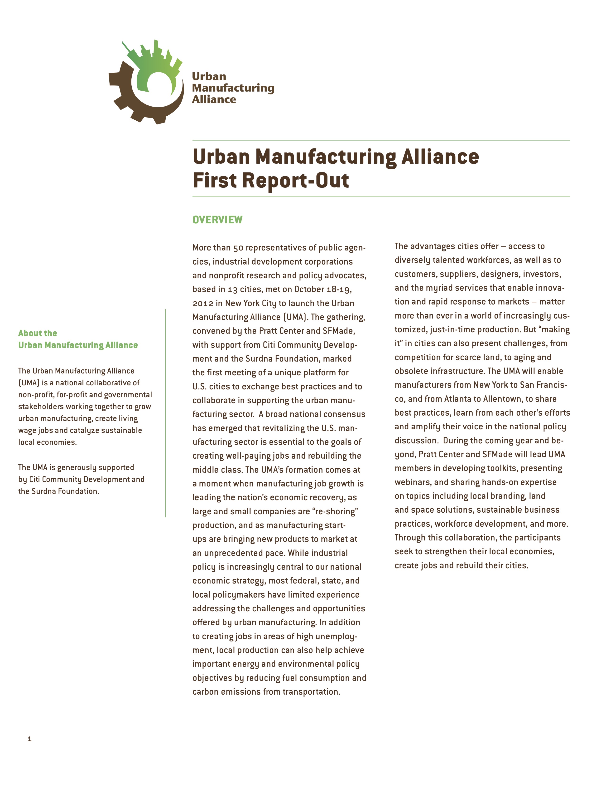 More than 50 representatives of public agencies, industrial development corporations and nonprofit research and policy advocates, based in 13 cities, met on October 18-19, 2012 in New York City to launch the Urban Manufacturing Alliance (UMA). The gathering, convened by the Pratt Center and SFMade, with support from Citi Community Development and the Surdna Foundation, marked the first meeting of a unique platform for U.S. cities to exchange best practices and to collaborate in supporting the urban manufacturing sector. A broad national consensus has emerged that revitalizing the U.S. manufacturing sector is essential to the goals of creating well-paying jobs and rebuilding the middle class. The UMA’s formation comes at a moment when manufacturing job growth is leading the nation’s economic recovery, as large and small companies are “re-shoring” production, and as manufacturing start-ups are bringing new products to market at an unprecedented pace. While industrial policy is increasingly central to our national economic strategy, most federal, state, and local policymakers have limited experience addressing the challenges and opportunities offered by urban manufacturing. In addition to creating jobs in areas of high unemployment, local production can also help achieve important energy and environmental policy objectives by reducing fuel consumption and carbon emissions from transportation.